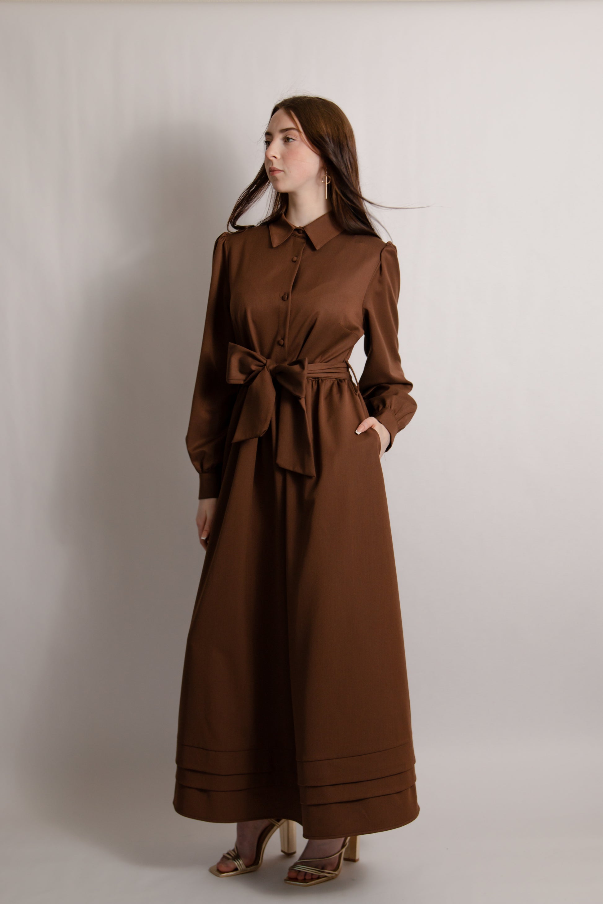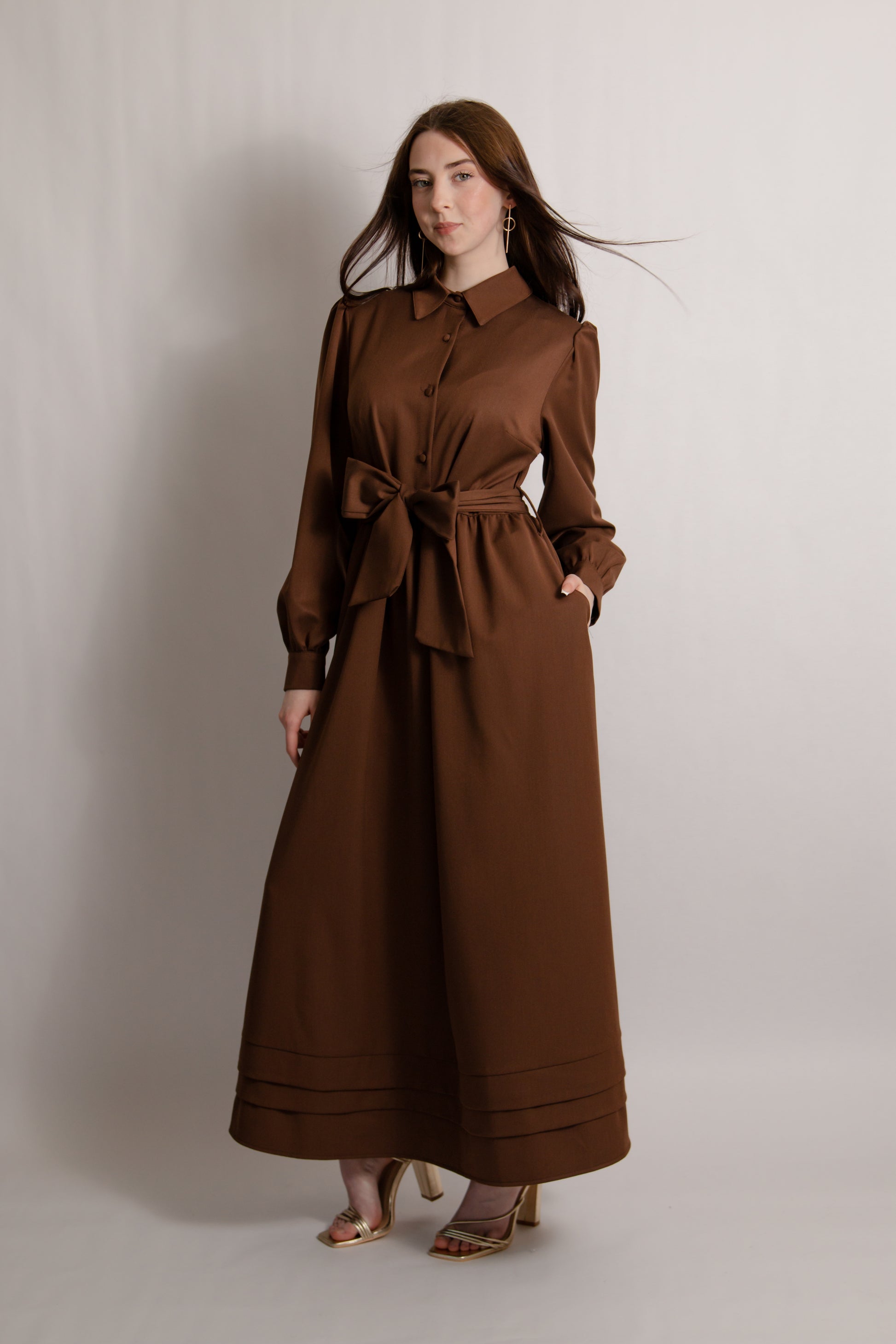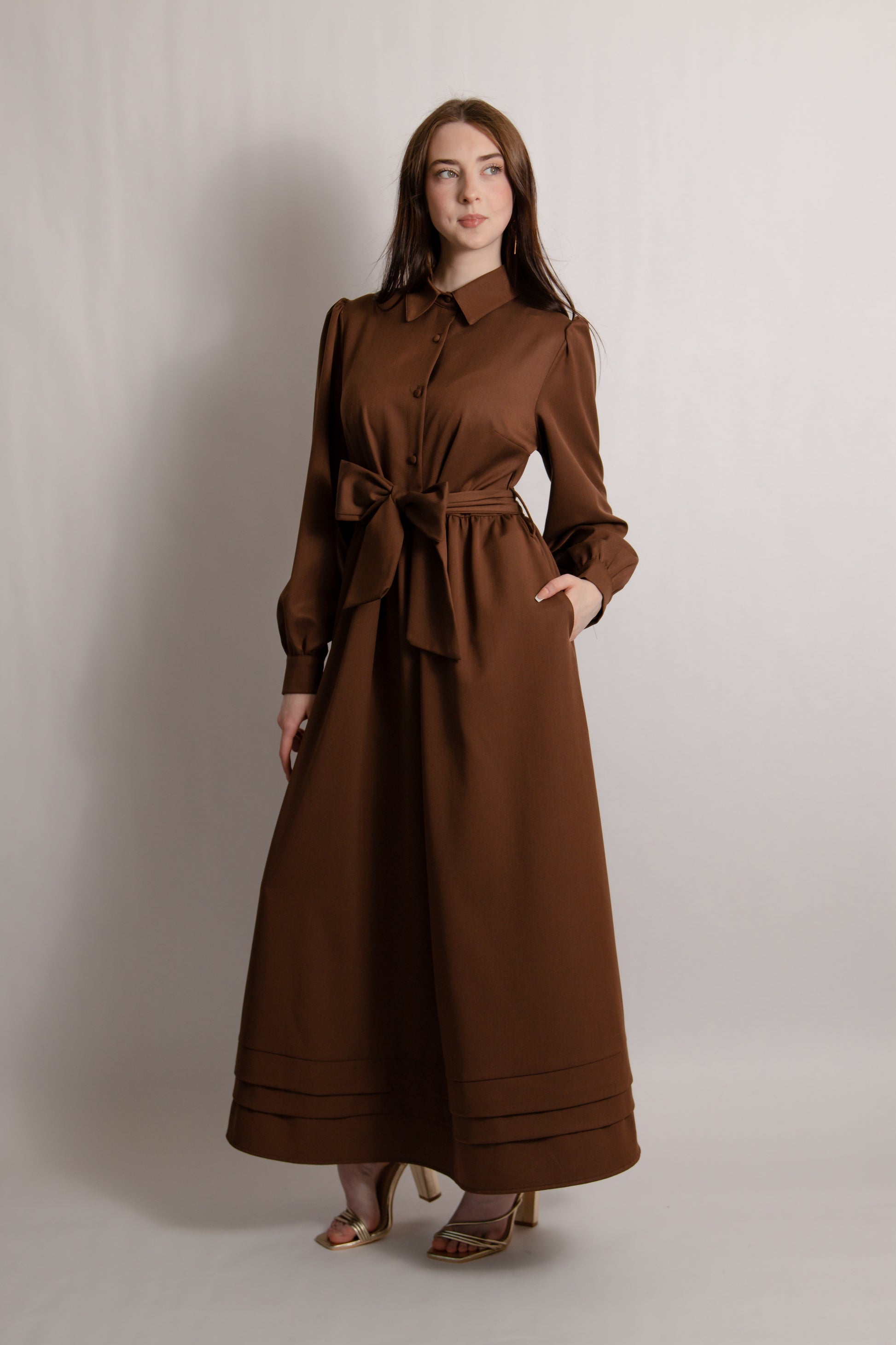 Dress with a gathered waist, hidden pockets, a belt, and a pintuck hem.