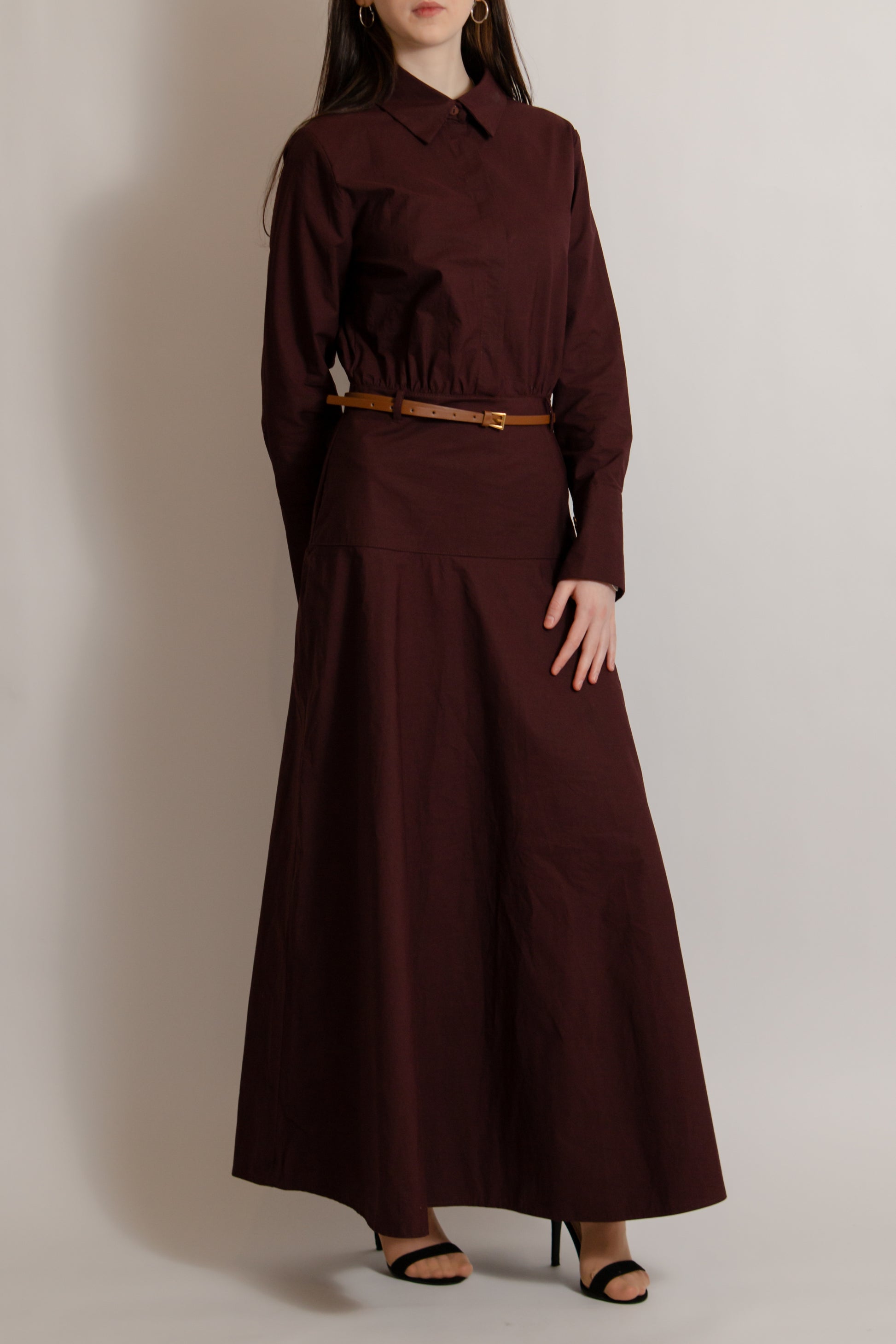 Expertly crafted from high-quality cotton, this burgundy dress is the perfect addition to any wardrobe. With its included belt, you can effortlessly create a defined waistline, making it flattering for all body types. The breathable fabric and versatile color make it a timeless and comfortable choice.