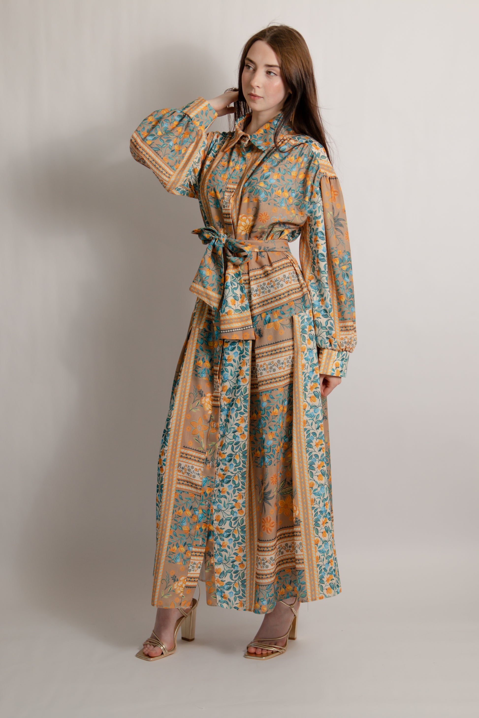 It features front buttons, a detachable belt, and pleats at the shoulders and hips.