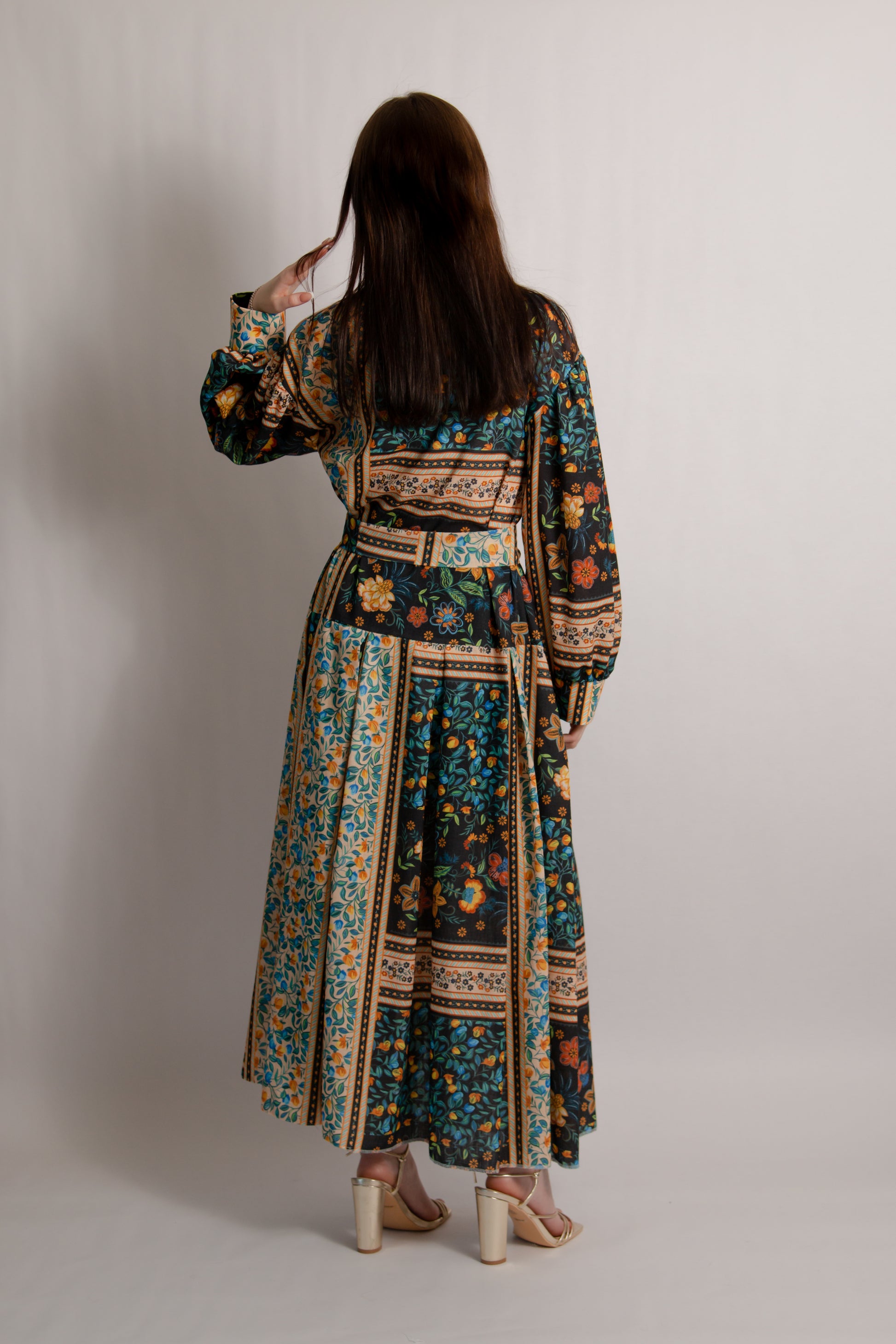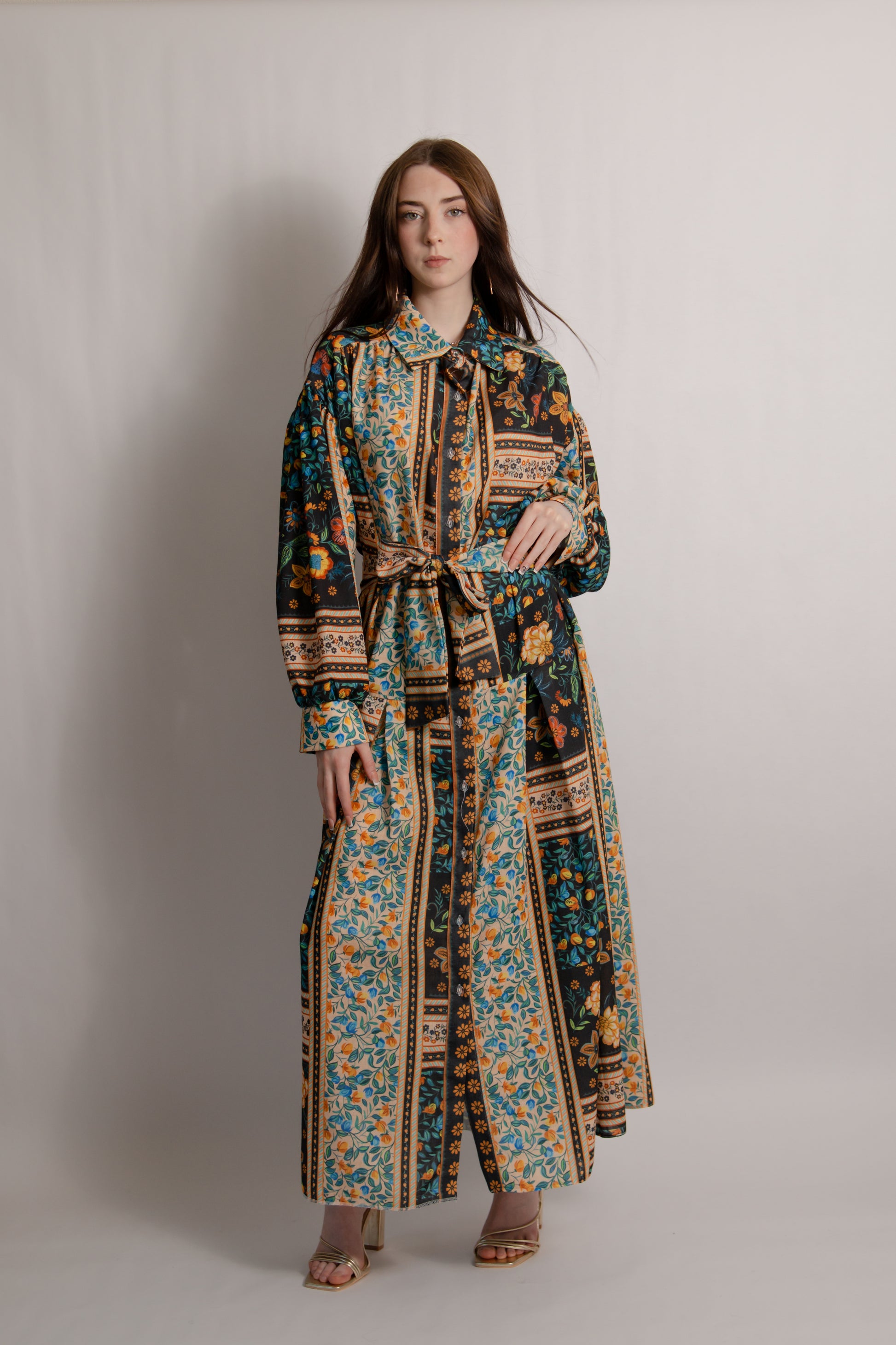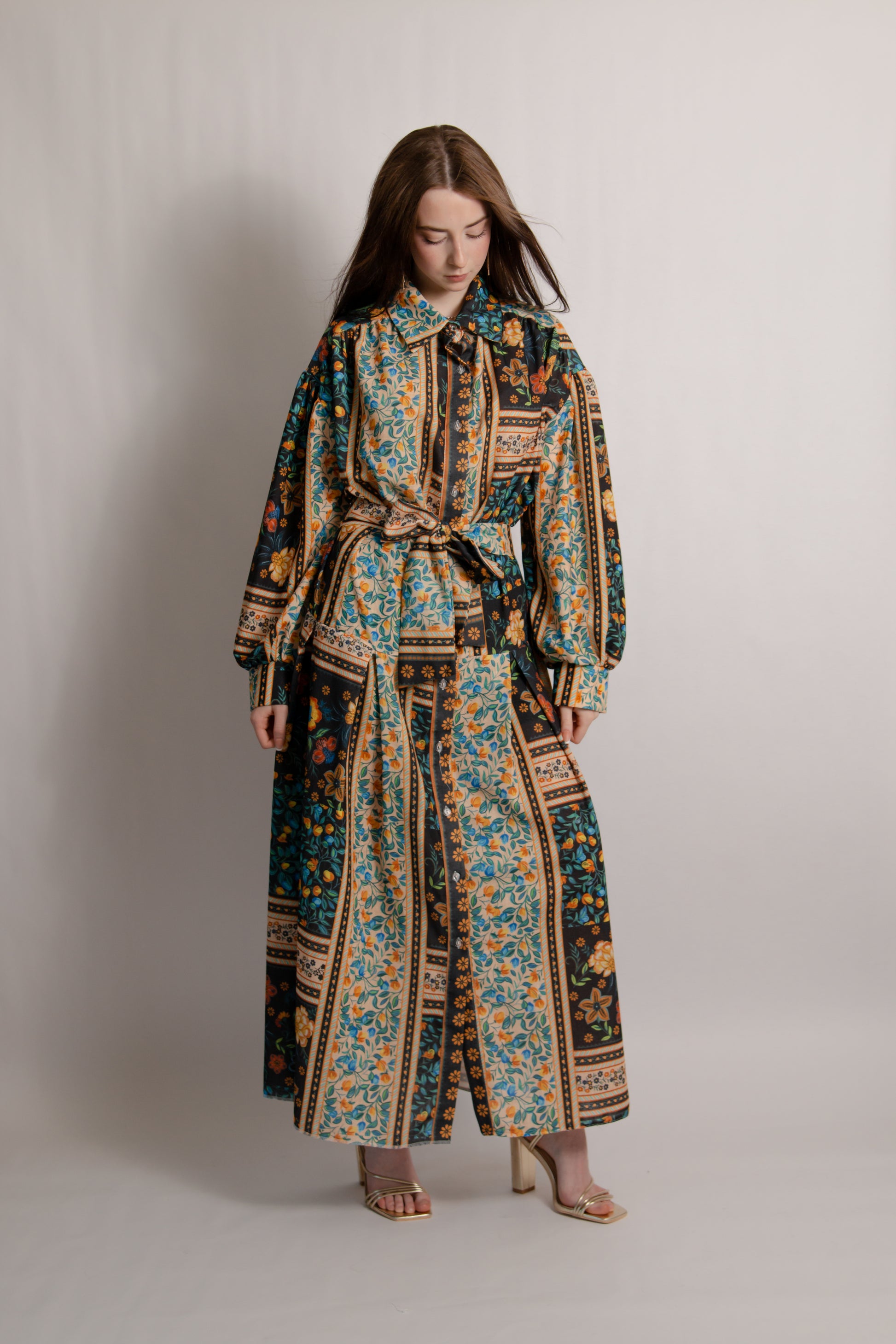 It features front buttons, a detachable belt, and pleats at the shoulders and hips.