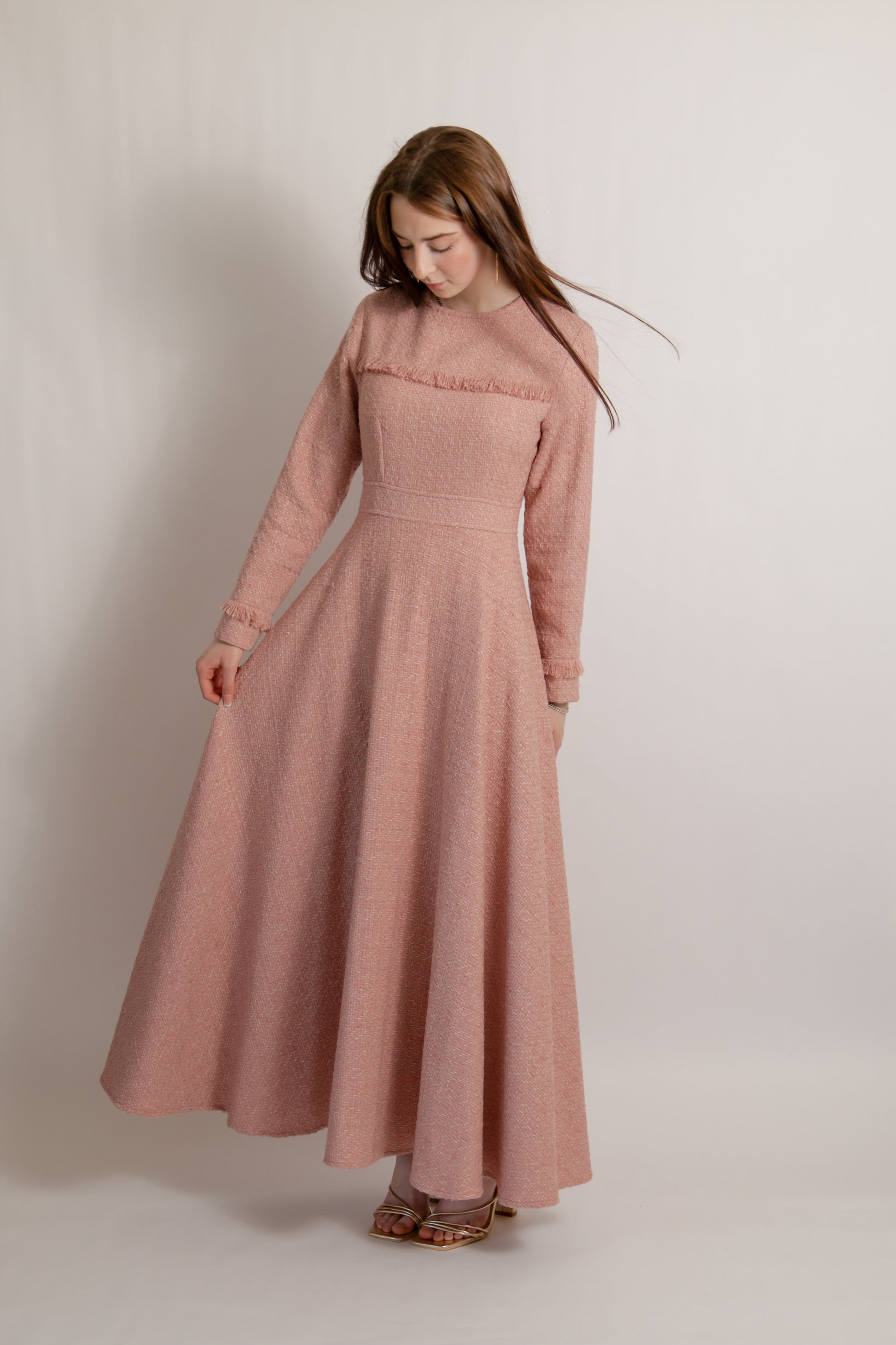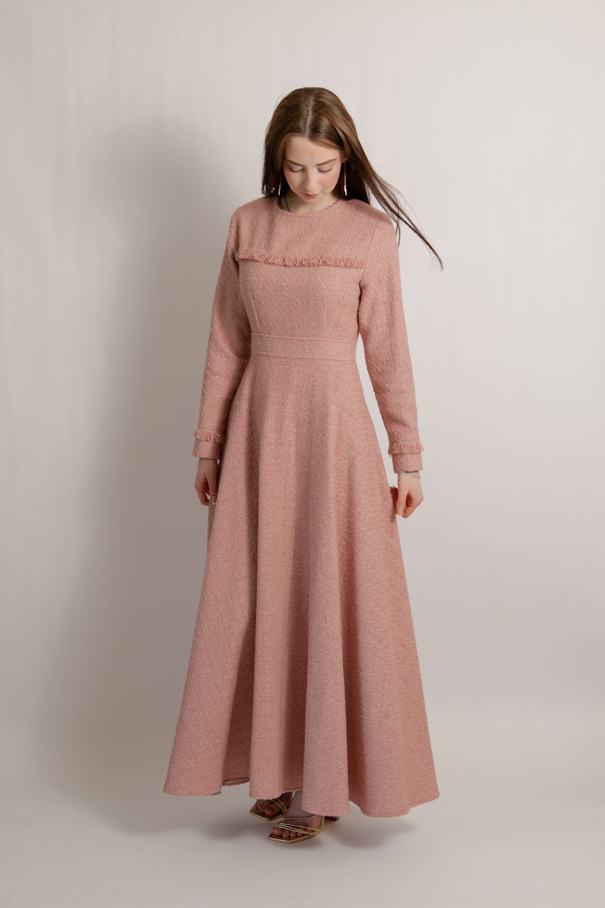 This stylish pink tweed dress is a must-have for any fashion-forward wardrobe. The classic tweed fabric adds a touch of sophistication, while the vibrant pink color makes a bold statement. Perfect for any occasion, this dress will have you looking and feeling confident and chic.