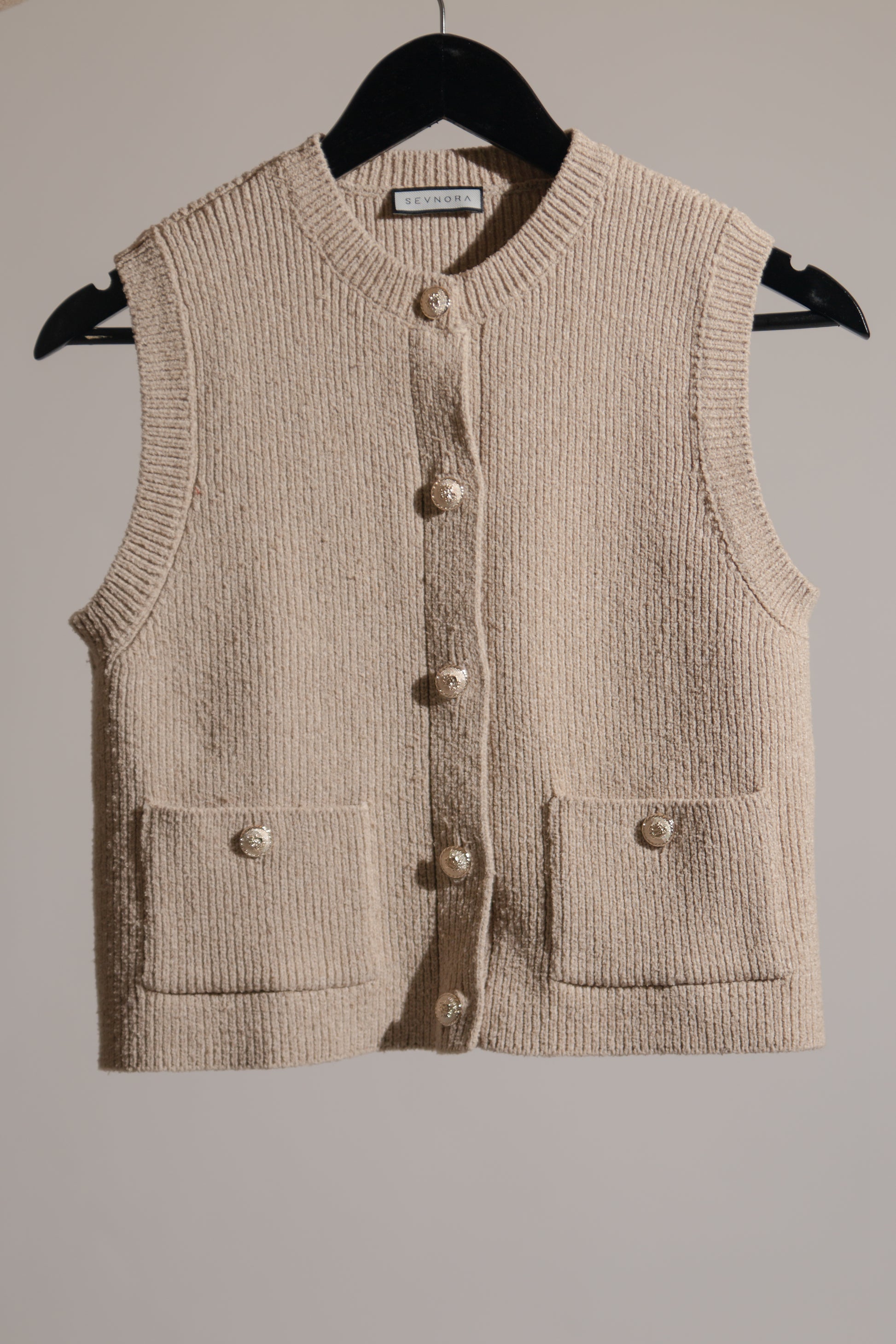 This waistcoat top is a must-have for any wardrobe. With its gold buttons and knit fabric, it adds a touch of sophistication to any outfit. The versatile design allows for easy layering and the durable material ensures long-lasting wear. Elevate your style with this stylish and functional piece.